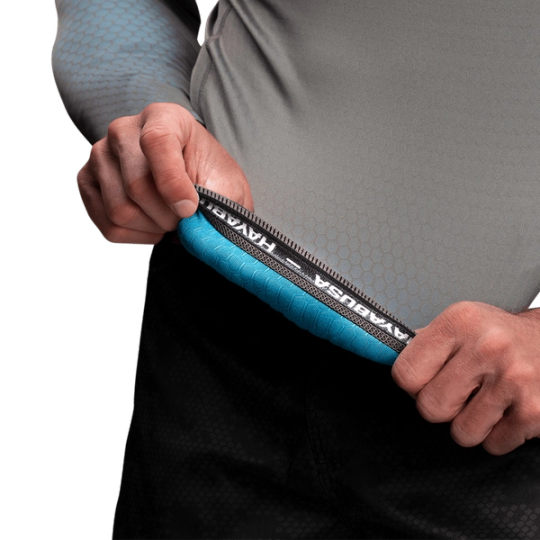 - Silicone waistband locks rash guard in place