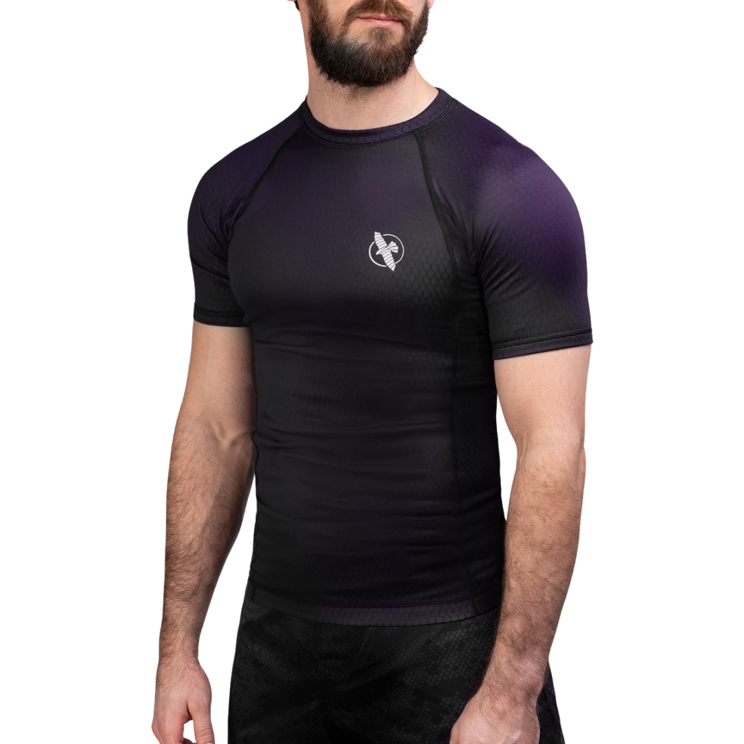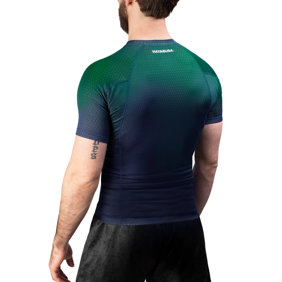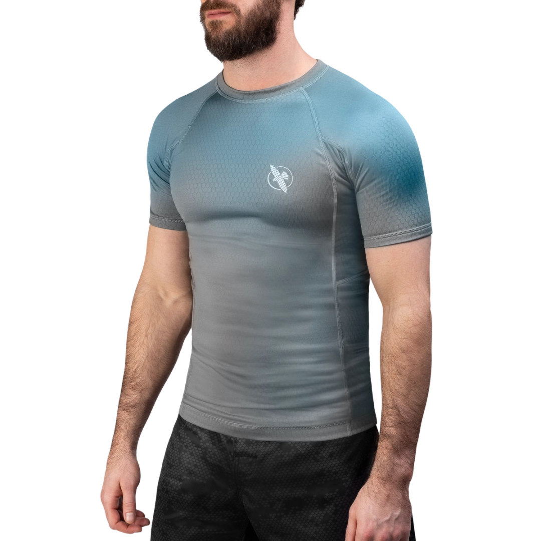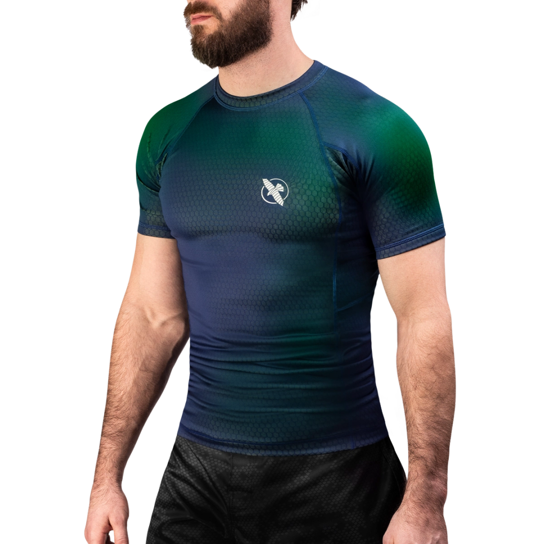 The Fusion Short Sleeve BJJ Rash Guard keeps you at your peak when your training gets heated. The smooth, form-fitting design feels like a second skin, wicking away sweat to keep you cool and adapting to your movement with its color-shifting design. Locked in place with a comfortable silicone waistband, the reinforced fabric provides an essential layer of protection to shield your skin from mat burns and scratches during your jiu-jitsu session.