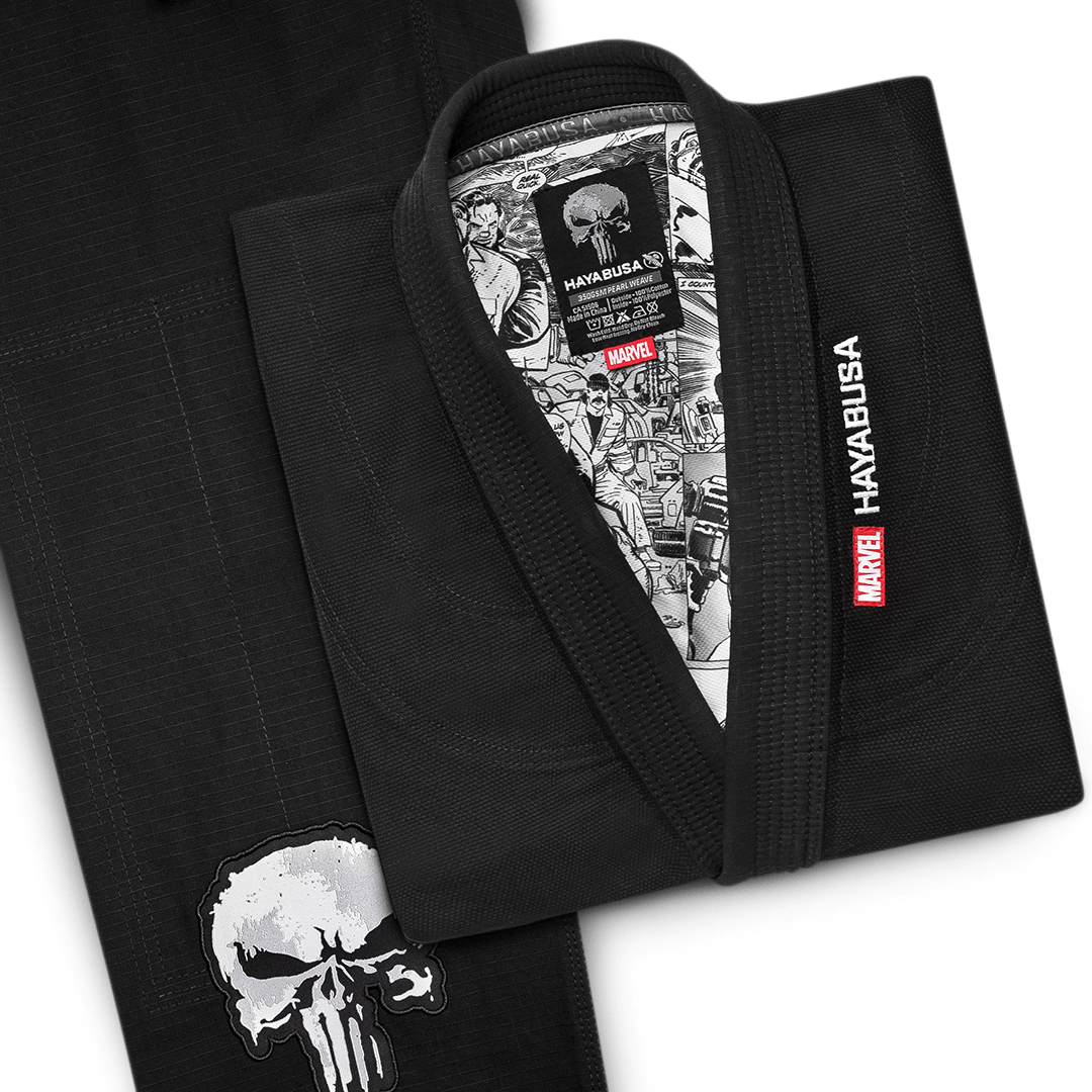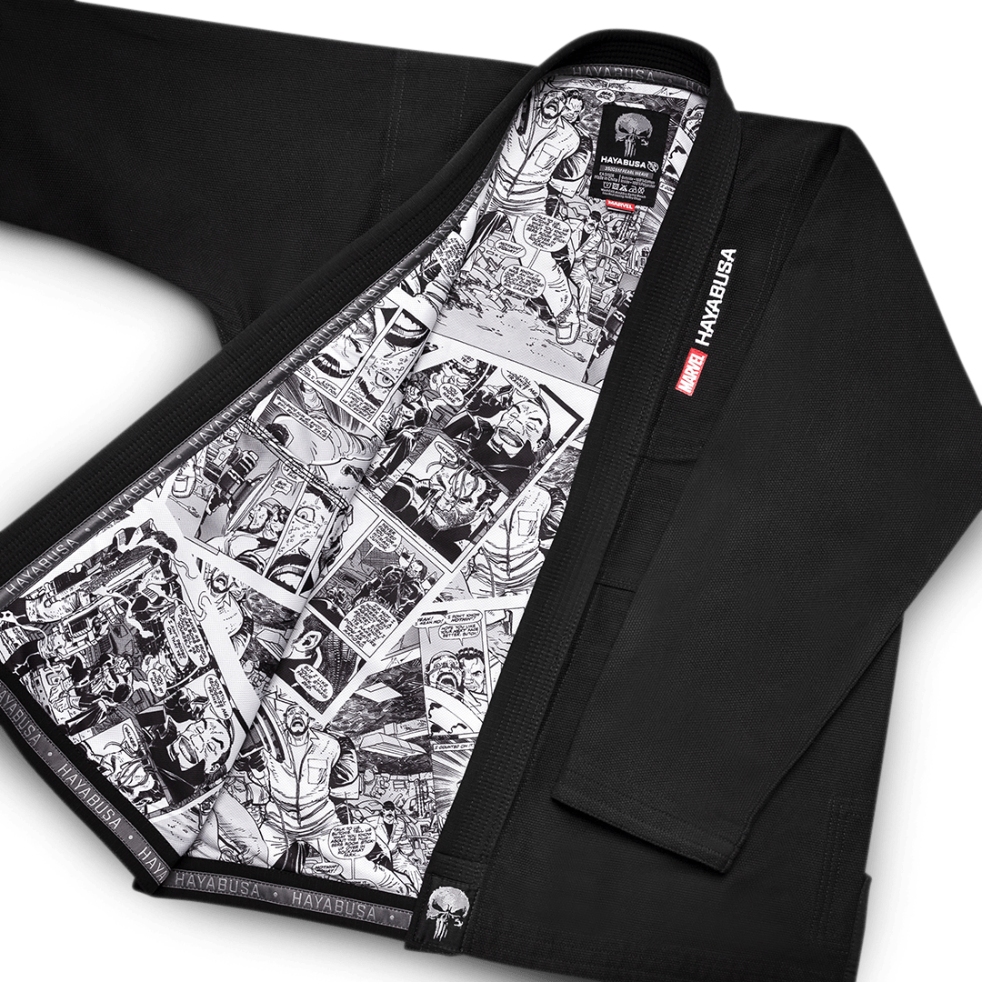 The Punisher Gi was built to become your ultimate weapon. Durable, comfortable, and incredibly light. The dark rugged design is accompanied by Frank’s signature warning to all who oppose him, The Punisher skull. Plus, the interior lining also incorporates classic Punisher comic book art. This gi is built on the same cut and materials as our Pearl Weave Ultra Light Weight Gi so you can experience the top performance when rolling with the Punisher Gi.